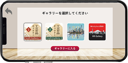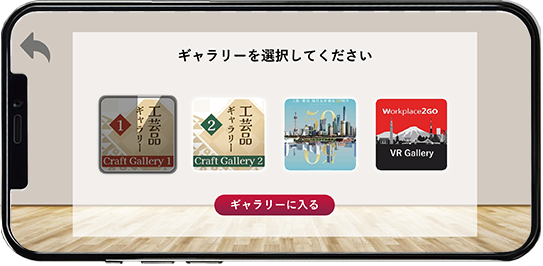 上部の< >で前後の展示品に移動します。ギャラリー会場に戻るには、左上の矢印をタップします。